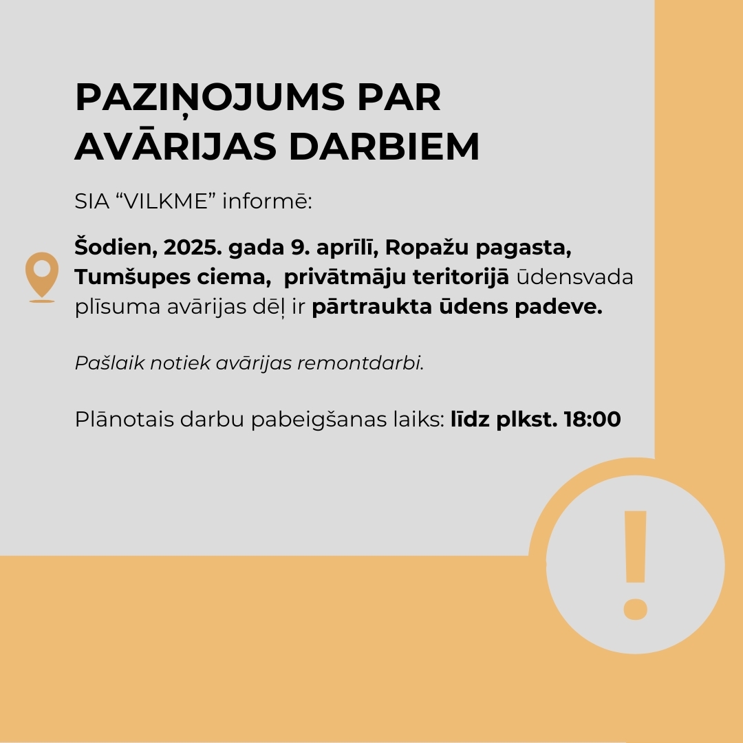 Informējam, ka šodien, 2025. gada 9. aprīlī, Ropažu pagasta, Tumšupes ciema, privātmāju teritorijā ūdensvada plīsuma avārijas dēļ ir pārtraukta ūdens padeve.